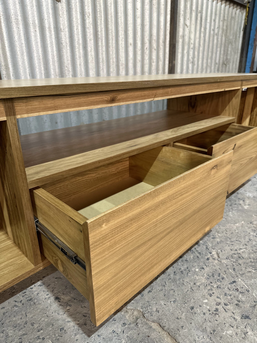Este rack está hecho en madera Paraiso y Petiribi, combinando durabilidad y estilo. Con una estructura maciza y tapas de puertas y cajones enchapados en madera natural, es el complemento perfecto para tu living. Equipado con herrajes metálicos y correderas telescópicas pesadas, garantiza un funcionamiento suave y resistente. Su terminación en hidrolaca satinada resalta la belleza de la madera.